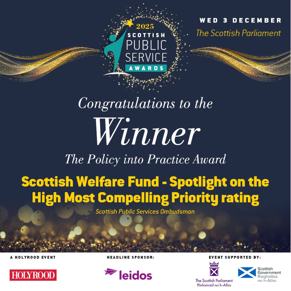 We were delighted to be announced as winners of the Policy into Practice Award at the Scottish Public Service Awards 2025 on 3 December at the Scottish Parliament!